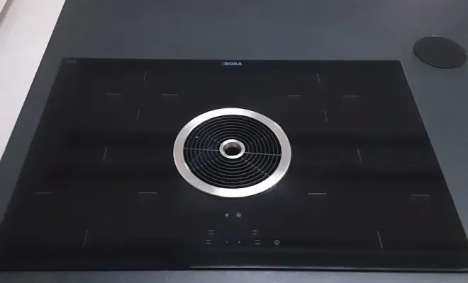 Pose d'une plaque de cuisson avec aspiration intégrée, cuve évier collée par le dessous avec égouttoir décaissé.
