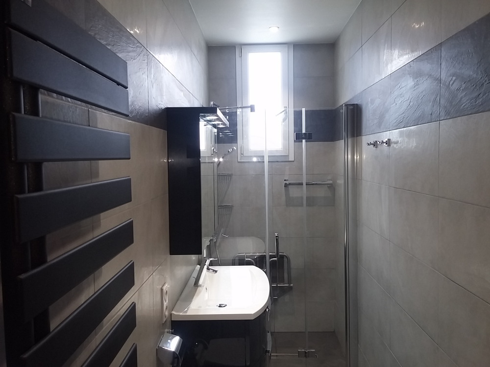 Réalisation d'une Salle de Bains très fonctionnelle malgré sa petite largeur.